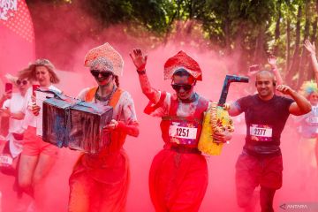 SEjumlah peserta yang mengenakan kostum nasional Rusia berlari melewati bedak berwarna saat mengikuti lomba Color Run di Moskow, Rusia, minggu (5/5/2022). ANTARA FOTO/Reuters- Maxim Shemetov/hp.