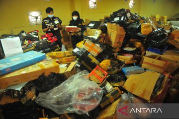 Petugas Bea dan Cukai menunjukan paket barang yang berisi rokok Sigaret Kretek Mesin (SKM) ilegal di kantor Bea dan Cukai Kudus, Jawa Tengah, Senin (6/6/2022). Bea Cukai Kudus pada bulan Januari hingga Mei 2022 berhasil menyita rokok ilegal dari beberapa tempat Jasa Pengiriman Barang dengan rokok yang dipasarkan melalui situs jual beli daring serta dari sejumlah produsen rokok ilegal di Jepara dengan total barang sitaan sekitar 5,284 juta batang rokok dengan perkiraan potensi kerugian negara mencapai Rp4,1 milliar. ANTARA FOTO/Yusuf Nugroho/rwa.