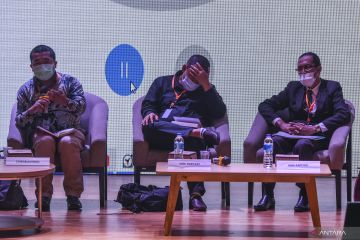 Calon Anggota Komnas HAM 2022-2027 Chrisbiantoro (kiri) , Dedi Haryadi (tengah), Hari Antono (kanan) melakukan dialog di Perpustakaan Nasional, Jakarta, Rabu (8/6/2022). Komnas HAM RI menggelar dialog publik untuk menyeleksi Calon Anggota Komnas HAM RI Periode 2022-2027 terkait isu - isu HAM terkini. ANTARA FOTO/Galih Pradipta/foc.