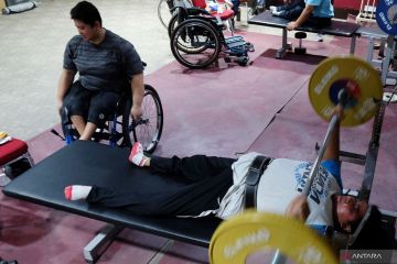 Atlet angkat berat National Paralympic Committee (NPC) mengikuti pemusatan latihan (Pelatnas) untuk ajang ASEAN Para Games (APG) XI 2022 di Solo, Jawa Tengah, Kamis (9/6/2022). Tim NPC Indonesia menargetkan enam medali emas untuk cabang olahraga angkat berat dan juara umum pada ajang ASEAN Para Games XI 2022 tersebut. ANTARAFOTO/Maulana Surya/foc.