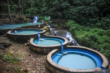 Wisatawan berenang di kolam renang kawasan wisata Kampung Ciherang, Tanjungsari, Kabupaten Sumedang, Jawa Barat, Sabtu (11/6/2022). Kampung Ciherang memiliki potensi wisata berupa wana wisata air, outbond dan hutan pinus yang belum ramai dikunjungi oleh wisatawan dari luar Kabupaten Sumedang. ANTARA FOTO/Raisan Al Farisi/foc.
