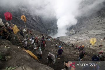 Masyarakat Suku Tengger melarung sesaji ke kawah Gunung Bromo pada Upacara Yadnya Kasada di Desa Ngadisari, Sukapura, Probolinggo, Jawa Timur, Kamis (16/6/2022). Upacara Kasada merupakan upacara adat masyarakat Suku Tengger sebagai bentuk ucapan syukur kepada Sang Hyang Widi sekaligus meminta berkah dan menjauhkan dari malapetaka. ANTARA FOTO/Umarul Faruq/rwa.