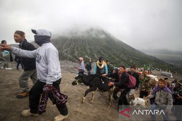 Warga Suku Tengger membawa seekor sapi dan kambing untuk dilarung ke kawah Gunung Bromo pada Upacara Yadnya Kasada di Desa Ngadisari, Sukapura, Probolinggo, Jawa Timur, Kamis (16/6/2022). Upacara Kasada merupakan upacara adat masyarakat Suku Tengger sebagai bentuk ucapan syukur kepada Sang Hyang Widi sekaligus meminta berkah dan menjauhkan dari malapetaka. ANTARA FOTO/Umarul Faruq/rwa.