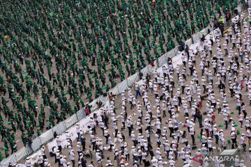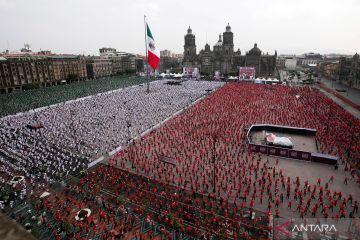 Warga menghadiri latihan tinju massal untuk memecahkan Guinness World Record dalam hal latihan tinju bersama selama 30 menit di lapangan Zocalo, Meksiko, Sabtu (18/6/2022). ANTARA FOTO/ REUTERS/Quetzalli Nicte-Ha/foc.