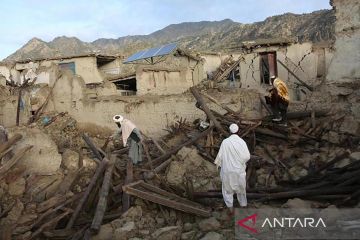 Sejumlah orang berdiri di atas reruntuhan rumah yang rusak akibat gempa di Provinsi Paktika, Afghanistan, Kamis (23/6/2022). Pemerintah yang dikelola Taliban di Afghanistan meminta bantuan internasional di tengah pelaksanaan operasi penyelamatan pascagempa dahsyat pada Rabu (22/6) di wilayah timur negara Asia itu. ANTARA FOTO/Xinhua/Saifurahman Safi/aww.