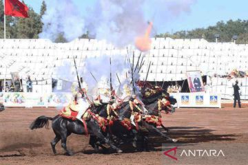 Sejumlah penampil berkostum tradisional menunggang kuda dalam pertunjukan berkuda Fantasia di Rabat, Maroko, Senin (27/6/2022). Fantasia merupakan ekshibisi tradisional untuk memamerkan keahlian menunggang kuda yang digelar saat perayaan-perayaan festival budaya dan acara pernikahan. ANTARA FOTO/Xinhua/Chadi/rwa.