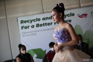 Seorang peragawati memamerkan busana dari limbah botol plastik di Surabaya, Jawa Timur, Selasa (28/6/2022). Busana-busana yang memanfaatkan botol plastik bekas rancangan siswa Lasalle Colege Surabaya itu bertema 'Recycle and Upcycle For A Better Future'. ANTARA FOTO/Didik Suhartono/hp.