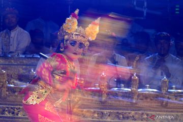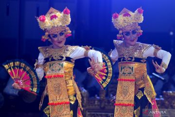 Penari Sanggar Seni Nretya Grha Siwanataraja Gianyar menampilkan Tari Legong Raja Cina dalam rangkaian Pesta Kesenian Bali (PKB) 2022 di Taman Budaya Bali, Denpasar, Bali, Selasa (28/6/2022). Pementasan tersebut dilakukan untuk melestarikan tarian yang merupakan tari klasik Bali itu kepada masyarakat khususnya generasi muda. ANTARA FOTO/Fikri Yusuf/hp.