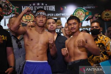 Petinju Indonesia Daud Yordan (kanan) berpose saat menimbang berat badan jelang bertanding melawan petinju Thailand Panya Uthok di Balai Sarbini, Jakarta, Kamis (30/6/2022). Pertandingan Daud vs Panya akan digelar pada Jumat (1/7) di Balai Sarbini, Jakarta, mempertaruhkan sabuk juara WBC Asian Boxing Council Silver kelas ringan super yang sedang dalam genggaman Daud Yordan. ANTARA FOTO/Hafidz Mubarak A/wsj.