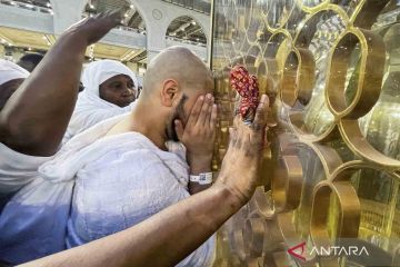 Jamaah calon haji berdoa di Maqam Ibrahim di Masjidil Haram dalam rangkaian ibadah Haji di Kota Suci Mekah, Arab Saudi, Jumat (1/7/2022). Jamaah calon haji akan melakukan wukuf di Arafah mulai Kamis 7 Juli malam hingga Jumat 8 Juli malam. ANTARA FOTO/REUTERS/Mohammed Salem/wsj.