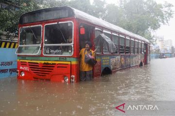 Seorang pria berusaha turun dari bus yang mogok setelah melintasi banjir di Mumbai, India, Selasa (5/7/2022). Hujan muson dari Juni hingga September mengakibatkan kerusakan yang meluas. ANTARA FOTO/REUTERS/Francis Mascarenhas /rwa.