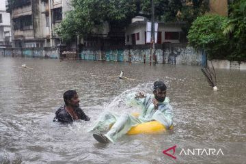 Seorang pria memercikkan air kepada temannya saat banjir di Mumbai, India, Selasa (5/7/2022). Hujan muson dari Juni hingga September mengakibatkan kerusakan yang meluas. ANTARA FOTO/REUTERS/Francis Mascarenhas /rwa.