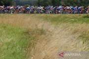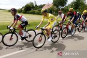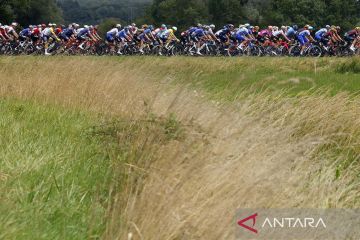 Pelonton melaju saat balapan etape 8 Tour de France dari Dole ke Lausanne sejauh 186 km di Prancis (9/7/2022). ANTARA FOTO/REUTERS/Gonzalo Fuentes/aww.