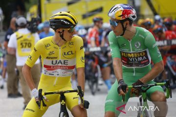 Pembalap sepeda Uae Team Emirates Tadej Pogacar yang mengenakan jersey kuning (kiri) berbincang dengan pembalap Jumbo Visma's Wout Van Aert yang mengenakan jersey hijau sebelum start etape 8 Tour de France dari Dole ke Lausanne sejauh 186 km di Prancis (9/7/2022). ANTARA FOTO/REUTERS/Gonzalo Fuentes/aww.