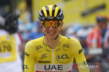 Pembalap sepeda Uae Team Emirates Tadej Pogacar mengenakan jersey kuning sebelum start etape 8 Tour de France dari Dole ke Lausanne sejauh 186 km di Prancis (9/7/2022). ANTARA FOTO/REUTERS/Gonzalo Fuentes/aww.