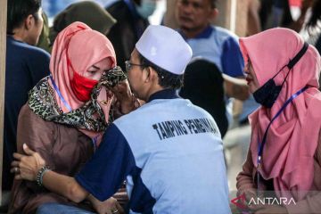 Warga binaan permasyarakatan memeluk keluarganya saat menerima kunjungan di Lembaga Pemasyarakatan (Lapas) kelas IIA Sidoarjo, Jawa Timur, Selasa (12/7/2022). Lapas dan Rutan kembali membuka layanan kunjungan tatap muka bagi keluarga warga binaan Pemasyarakatan (WBP) yang sudah mendapatkan vaksinasi booster setelah 2,5 tahun dihentikan akibat pandemi COVID-19. ANTARA FOTO/Umarul Faruq/wsj.