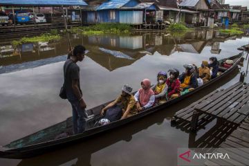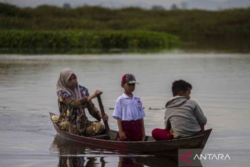 Orang tua mengantarkan anaknya ke sekolah menggunakan perahu menuju ke SD Negeri 3 Sungai Buluh di Kecamatan Labuan Amas Utara, Kabupaten Hulu Sungai Tengah, Kalimantan Selatan, Selasa (12/7/2022). Sekolah yang berada di tengah-tengah rawa itu merupakan sekolah satu-satunya di Dusun Awang Landas dan jalur sungai menjadi satu-satunya jalur yang digunakan oleh guru dan muridnya untuk menuju sekolah tersebut karena tidak ada akses jalan darat. ANTARA FOTO/Bayu Pratama S/wsj.