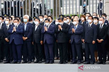 Sejumlah anggota parlemen berdoa saat iring-iringan mobil jenazah melintas usai pemakaman mendiang mantan PM Jepang Shinzo Abe di Kuil Zojoji, Tokyo, Jepang, Selasa (12/7/2022). ANTARA FOTO/REUTERS/Kim Kyung-Hoon/wsj.