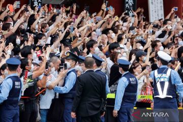 Polisi berjaga di depan orang-orang yang melihat iring-iringan mobil jenazah usai pemakaman mendiang mantan PM Jepang Shinzo Abe di Kuil Zojoji, Tokyo, Jepang, Selasa (12/7/2022). ANTARA FOTO/REUTERS/Issei Kato/wsj.