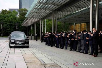 Mobil jenazah yang membawa mendiang mantan PM Jepang Shinzo Abe melintas di depan Kantor PM Jepang sebelum menuju lokasi pemakaman di Kuil Zojoji, Tokyo, Jepang, Selasa (12/7/2022). ANTARA FOTO/Eugene Hoshiko/Pool via REUTERS/wsj.