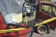 Refleksi petugas Kepolisian memasang garis polisi di barang bukti mobil truk yang digunakan untuk membawa gas Elpiji yang telah disuntik di Pulogebang, Jakarta Timur, Jumat (15/7/2022). Direktorat Tindak Pidana Tertentu Bareskrim Polri mengungkap kasus penyalahgunaan Elpiji bersubsidi dengan modus operandi menyuntikkan gas Elpiji 3 Kg ke tabung ukuran 5,5 kg hingga 50 kg dengan total 3.344 tabung dan mengamankan 15 orang tersangka. ANTARA FOTO/ Fakhri Hermansyah/wsj.