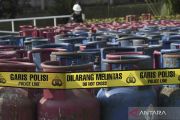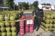 Petugas keamanan berjaga di samping barang bukti gas Elpiji yang telah dioplos di Pulogebang, Jakarta Timur, Jumat (15/7/2022). Direktorat Tindak Pidana Tertentu Bareskrim Polri mengungkap kasus penyalahgunaan Elpiji bersubsidi dengan modus operandi menyuntikkan gas Elpiji 3 Kg ke tabung ukuran 5,5 kg hingga 50 kg dengan total 3.344 tabung dan mengamankan 15 orang tersangka. ANTARA FOTO/ Fakhri Hermansyah/wsj.