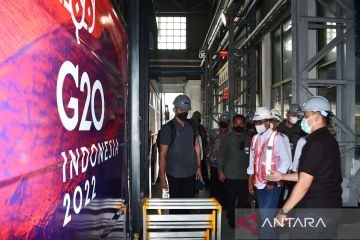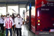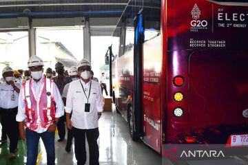Sejumlah orang melihat Bus Listrik G20 produksi PT INKA (Persero) saat kunjungan kerja Menteri Perhubungan Budi Karya Sumadi di PT INKA (Persero) Madiun, Jawa Timur, Minggu (17/7/2022). Dalam kunjungan kerjanya tersebut Budi Karya Sumadi ingin memastikan bus listrik buatan PT INKA siap digunakan untuk kegiatan Konferensi Tingkat Tinggi G20 Bali mendatang. ANTARA FOTO/Siswowidodo/aww.