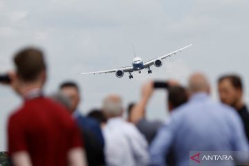 Pengunjung menyaksikan pesawat Boeing 777X dalam perhelatan Farnborough International Airshow di Farnborough, Inggris, Rabu (20/7/2022). ANTARA FOTO/REUTERS/Peter Cziborra/foc.
