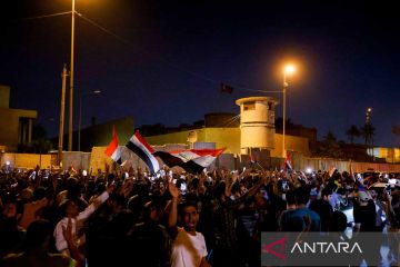Pengunjuk rasa berkumpul di depan gedung milik Kedutaan Besar Turki di Baghdad setelah serangan artileri yang menghantam resort pegunungan di provinsi utara Dohuk, Irak, Rabu (20/7/2022). Turki membantah serangan tersebut dan menuding pasukan Partai Pekerja Kurdistan yang melakukan serangan tersebut. ANTARA FOTO/REUTERS/Ahmed Saad/rwa.