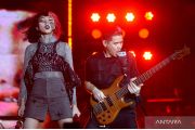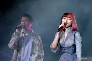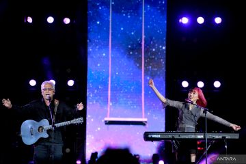 Penyanyi Isyana Sarasvati (kanan) berkolaborasi dengan Afgan (kiri) saat konser bertajuk 'Lexiconcert Live on Tour' di kawasan Nusa Dua, Badung, Bali, Jumat (22/7/2022). Pada konser terakhir dalam rangkaian 'Lexiconcert Live on Tour' babak pertama tersebut, Isyana Sarasvati membawakan sejumlah lagu seperti Lexicon, Il Sogno, Unlock the Key serta Sikap Duniawi. ANTARA FOTO/Fikri Yusuf/hp.