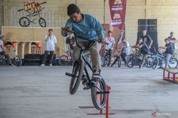Peserta unjuk gaya bebas saat peringatan Hari BMX Sedunia di Progressif Bike Park, Bandung, Jawa Barat, Minggu (24/7/2022). Ratusan pesepeda BMX dari berbagai kota di Jawa Barat dan Jakarta hingga Bali mengikuti peringatan Hari BMX Sedunia yang dimulai dengan konvoi BMX bersama serta unjuk kemahiran dan parade kostum unik. ANTARA FOTO/Raisan Al Farisi/foc.