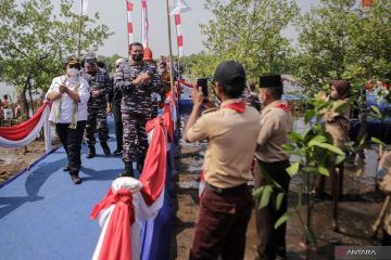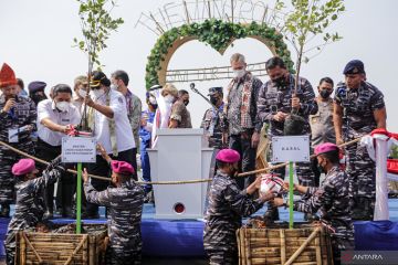 Menteri Lingkungan Hidup dan Kehutanan Siti Nurbaya Bakar (ketiga kiri) bersama Kepala Staf Angkatan Laut Laksamana TNI Yudo Margono (ketiga kanan) menanam bibit mangrove di Tanjung Pasir, Kabupaten Tangerang, Banten, Selasa (26/7/2022). TNI AL menggelar penanaman 1.000.377 bibit mangrove secara serentak di 77 lokasi di Indonesia untuk memperingati Hari Mangrove Sedunia yang jatuh pada tanggal 26 Juli. ANTARA FOTO/Fauzan/hp.