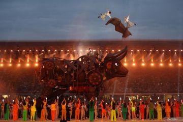 Suasana yang memperlihatkan banteng yang mengamuk saat upacara pembukaan pembukaan Commonwealth Games, di Stadion Alexander, Birmingham, Inggris, Kamis (28/7/2022). ANTARA FOTO/Reuters- -Hannah Mckay/hp.