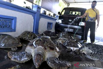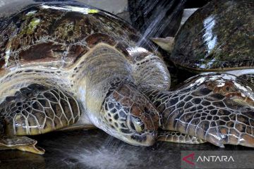 Seekor penyu hijau (Chelonia mydas) disiram air oleh petugas saat konferensi pers terkait penggagalan upaya penyelundupan penyu di kawasan Benoa, Denpasar, Bali, Jumat (29/7/2022). Personel Ditpolairud Polda Bali berhasil menggagalkan upaya penyelundupan 15 ekor penyu hijau yang ditangkap di Madura dan diselundupkan pelaku berinisial AS dan G ke wilayah Denpasar. ANTARA FOTO/Fikri Yusuf/wsj.