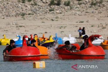 Warga bermain perahu bebek di Danau Qargha, Kabul, Afghanistan, Jumat (29/7/2022). Afghanistan, menurut Kelompok Tanggap Krisis Global dari Sekretaris Jenderal PBB, menjadi salah satu dari sembilan negara yang beresiko bangkrut seperti Sri Lanka dengan dimensi krisis pangan, energi dan sistem keuangan. ANTARA FOTO/REUTERS/Ali Khara/rwa.