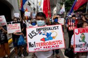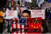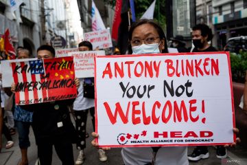 Aktivis Filipina membawa plakat saat melakukan aksi unjuk rasa di tengah kunjungan Menteri Luar Negeri AS Antony Blinken, di Manila, Filipina, Minggu (6/8/2022). ANTARA FOTO/ Reuters-Lisa Marie David/hp.