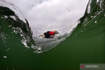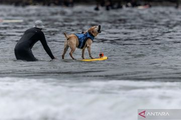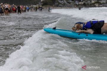 Anjing bernama Derbie mengikuti gelaran World Dog Surfing Championship di Pacifica, California, AS, Sabtu (6/8/2022). ANTARA FOTO/REUTERS/Carlos Barria/foc.