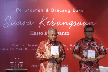 Doktor Ilmu Pertahanan yang juga Sekjen PDI Perjuangan (PDIP) Hasto Kristiyanto meluncurkan buku Suara Kebangsaan di Bentara Budaya, Jakarta, Minggu (7/8/2022). Peluncuran buku karya Hasto Kristiyanto yang berjudul Suara Kebangsaan tersebut tentang pemikiran geopolitik dan kebangsaan Soekarno yang masih relevan dengan kondisi dunia kini dan masa mendatang untuk diajarkan ke generasi anak bangsa. ANTARA FOTO/Asprilla Dwi Adha/foc.