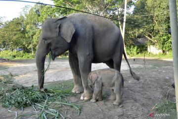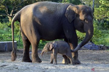 Seekor anak Gajah Sumatera (Elephas Maximus sumatranus) yang baru berumur dua hari bermain bersama induknya di Balai Konservasi Lembah Hijau, Bandar Lampung, Lampung, Senin (8/8/2022). Balai Konservasi yang memiliki Gajah Sumatera dari tahun 2016 tersebut untuk pertama kalinya berhasil mengembangbiakkan Gajah Sumatera dengan kelahiran anak gajah jantan pada 7 Agustus 2022 dan saat ini jumlah satwa endemik Indonesia yang dilindungi itu bertambah menjadi lima ekor, yakni tiga jantan dan dua betina. ANTARA FOTO/Ardiansyah/hp.