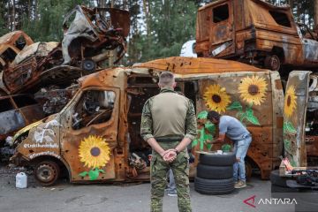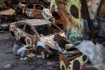 Seniman AS Trek Kelly melukis bunga-bunga matahari pada tumpukan bangkai mobil korban serangan Rusia yang dikumpulkan di Irpin, Kyiv, Ukraina, Rabu (10/8/2022). ANTARA FOTO/ REUTERS/Gleb Garanich/foc.