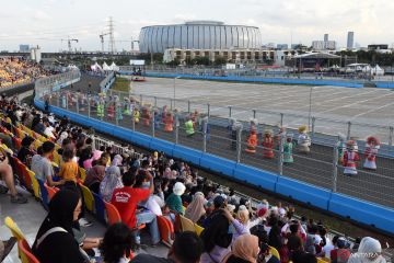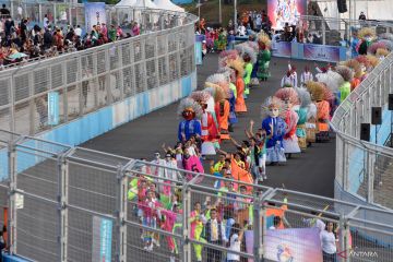 Peserta berparade dalam pagelaran Jakarnaval 2022 di Jakarta International Eprix Circuit, Ancol, Minggu (14/8/2022). Gelaran Jakarnaval 2022 yang mengangkat tema "Kekayaan Intelektual Nusantara untuk Dunia" tersebut menampilkan parade komunitas pegiat seni budaya, marching band, dan kendaraan hias tersebut. ANTARA FOTO/Indrianto Eko Suwarso/hp.