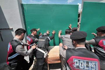 Tim gabungan berjalan di depan mobil yang terparkir di gudang penyimpanan minyak saat razia yang melibatkan aparat kepolisian, petugas satpol PP, dan instansi terkait di Kota Baru, Jambi, Selasa (16/8/2022). Razia yang hanya mendapati beberapa gudang minyak dalam keadaan yang diduga sudah dikosongkan dari aktivitas bongkar muat minyak itu dilakukan pascakebakaran sebuah gudang minyak ilegal di daerah itu pada Senin (15/8). ANTARA FOTO/Wahdi Septiawan/aww.