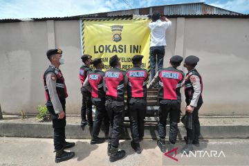 Tim gabungan memasang spanduk informasi penyelidikan pada dinding gudang penyimpanan minyak saat razia yang melibatkan aparat kepolisian, petugas satpol PP, dan instansi terkait di Kota Baru, Jambi, Selasa (16/8/2022). Razia yang hanya mendapati beberapa gudang minyak dalam keadaan yang diduga sudah dikosongkan dari aktivitas bongkar muat minyak itu dilakukan pascakebakaran sebuah gudang minyak ilegal di daerah itu pada Senin (15/8). ANTARA FOTO/Wahdi Septiawan/aww.