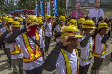 Sejumlah pekerja mengikuti pengibaran Bendera Merah Putih di lokasi titik nol Ibu Kota Negara (IKN) Nusantara di Kecamatan Sepaku, Kabupaten Penajam Paser Utara, Kalimantan Selatan, Rabu (17/8/2022). Dalam rangka memperingati hari kemerdekaan Republik Indonesia ke-77 pihak Otorita IKN Nusantara melaksanakan pengibaran Bendera Merah Putih pertama di kawasan titik nol IKN Nusantara yang melibatkan seluruh pekerja proyek, TNI, POLRI, Pemerintah Kecamatan,pelajar dan tokoh adat serta tokoh masyarakat. ANTARA FOTO/Bayu Pratama S/foc.