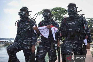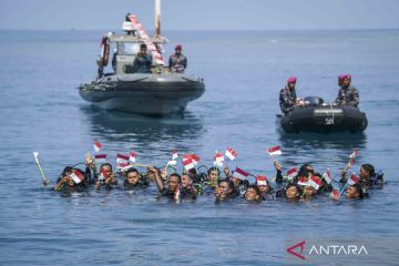 Penyelam dari Batalyon Intai Amfibi-1 Korps Marinir TNI AL membawa bendera Merah Putih yang akan dikibarkan di bawah laut di Pulau Putri, Kepulauan Seribu, Jakarta, Rabu (17/8/2022). TNI AL secara serentak melakukan upacara bendera Merah Putih di bawah laut di 77 lokasi laut Nusantara dalam rangka memeriahkan HUT ke-77 Kemerdekaan RI. ANTARA FOTO/M Risyal Hidayat/wsj.