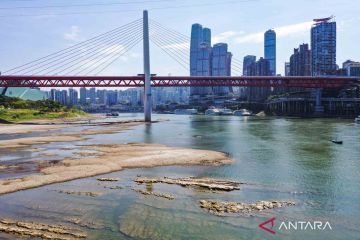 Foto dari udara situasi dari Sungai Jialing yang permukaan airnya menurun di Kota Chongqing, China barat daya, Rabu (17/8/2022). Penurunan debit air di bagian hulu, suhu tinggi yang berkepanjangan dan curah hujan yang lebih rendah membuat ketinggian air di Sungai Jialing yang mengalir melalui daerah perkotaan utama di Chongqing turun secara signifikan. ANTARA FOTO/Xinhua/Wang Quanchao/wsj.