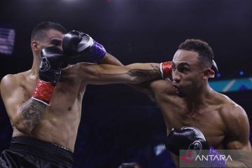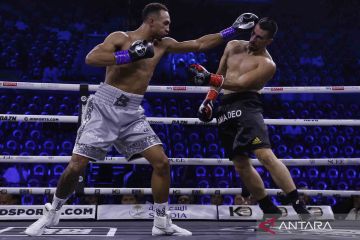 Petinju Inggris Ben Whittaker (kiri) melancarkan pukulan ke arah Petinju Kroasi Petar Nosic dalam pertandingan tinju dunia perebutan sabuk juara kelas berat ringan di Kompleks Olah Raga King Abdullah, Jeddah, Saudi Arabia, Sabtu (20/8/2022). Ben Whittaker menang dengan angka mutlak (unanimous decision) atas lawannya Petar Nosic dalam pertandingan yang digelar enam ronde tersebut. ANTARA FOTO/Action Images/Andrew Couldridge/via REUTERS/wsj.