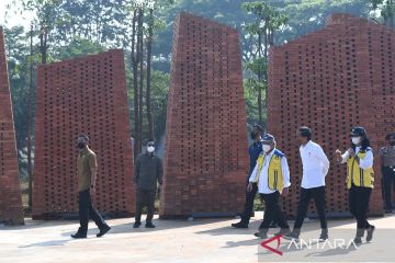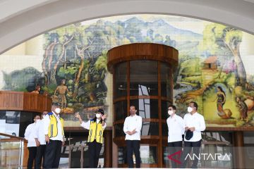 Presiden Joko Widodo (tengah) didampingi Menteri PUPR Basuki Hadimuljono (kiri) dan Mensesneg Pratikno (kanan) mendengarkan penjelasan dari Dirjen Cipta Karya Kementerian PUPR Diana Kusumastuti (kedua kiri) di area Taman Legenda Keong Mas saat meninjau revitalisasi Taman Mini Indonesia Indah (TMII) di Jakara, Selasa (23/8/2022). Proses revitalisasi TMII itu telah mencapai 98 persen dan TMII direncanakan akan menjadi salah satu lokasi KTT G20. ANTARA FOTO/Hafidz Mubarak A/aww.