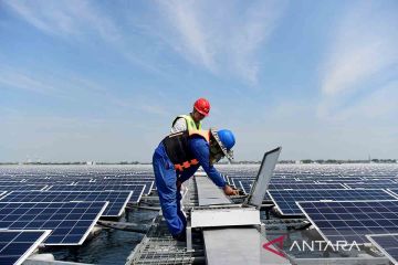 Pekerja melakukan pemeriksaan dan pemeliharaan pembangkit listrik fotovoltaik terapung Maowei di Gucheng, wilayah Yingshang, Provinsi Anhui, China timur, Kamis (25/8/2022). Gucheng mengubah kawasan bekas penambangan batu bara menjadi basis pembangkit listrik fotovoltaik terapung yang dioperasikan dengan kapasitas terpasang 130 MW. Rata-rata listrik yang dihasilkan per tahunnya mencapai 136 juta kilowatt-jam (kWh), menghemat sekitar 54.400 ton batu bara standar dan mengurangi 135.600 ton emisi karbon dioksida setiap tahun. ANTARA FOTO/Xinhua/Huang Bohan/rwa.