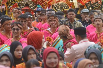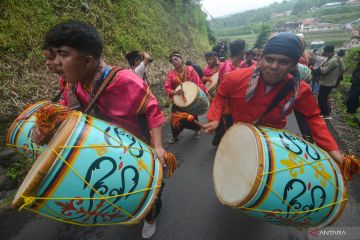 Warga memainkan gendang saat mengikuti parade 1.000 songket, pada Festival Pandai Sikek, di Nagari Pandai Sikek, Kabupaten Tanah Datar, Sumatera Barat, Sabtu (27/8/2022). Festival Pandai Sikek tersebut digelar Nagari Pandai Sikek dalam rangka memperkenalkan seni budaya dan produk khas daerah itu seperti tenun songket dan ukiran. ANTARA FOTO/Iggoy el Fitra/hp.